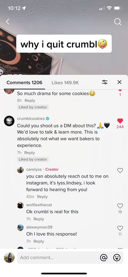 In an Instagram direct message to the Daily Dot, Lindsey said that while Crumbl has not reached out to her directly, the company's TikTok account commented on one of her videos asking her to get in touch.