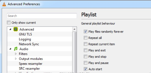 - Also in the Preferences window, select "All" on the bottom right "Show settings" button and then click "Playlist" and toggle "Play files randomly forever" on. This will make VLC play each show's episodes in a random order so you don't catch the same ones day after day.