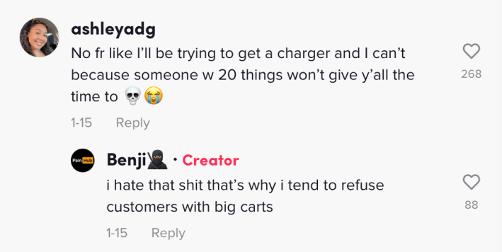 "No for real like I'll be trying to get a charger and I can't because someone with 20 things won't give y'all the time to," one wrote.