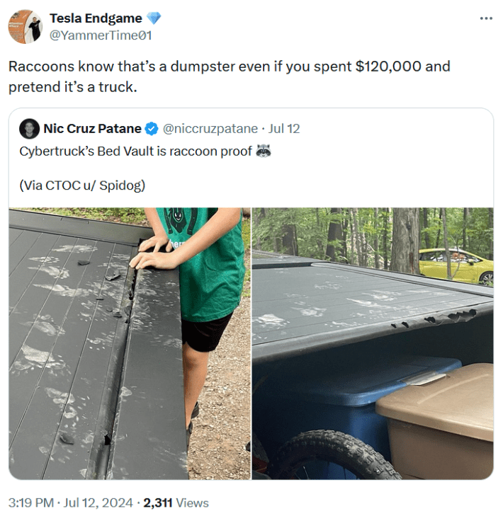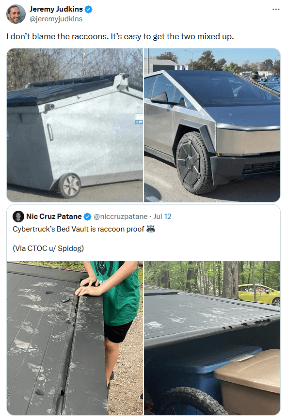 To get even more specific with the Cybertruck meme genre, one owner seemingly touting the vehicle as "raccoon proof" resulted in a mass number of quote tweets pointing out this only lends to the dumpster comparisons. After all, if anybody knows their dumpsters, it's raccoons. You can't fault them for getting confused.