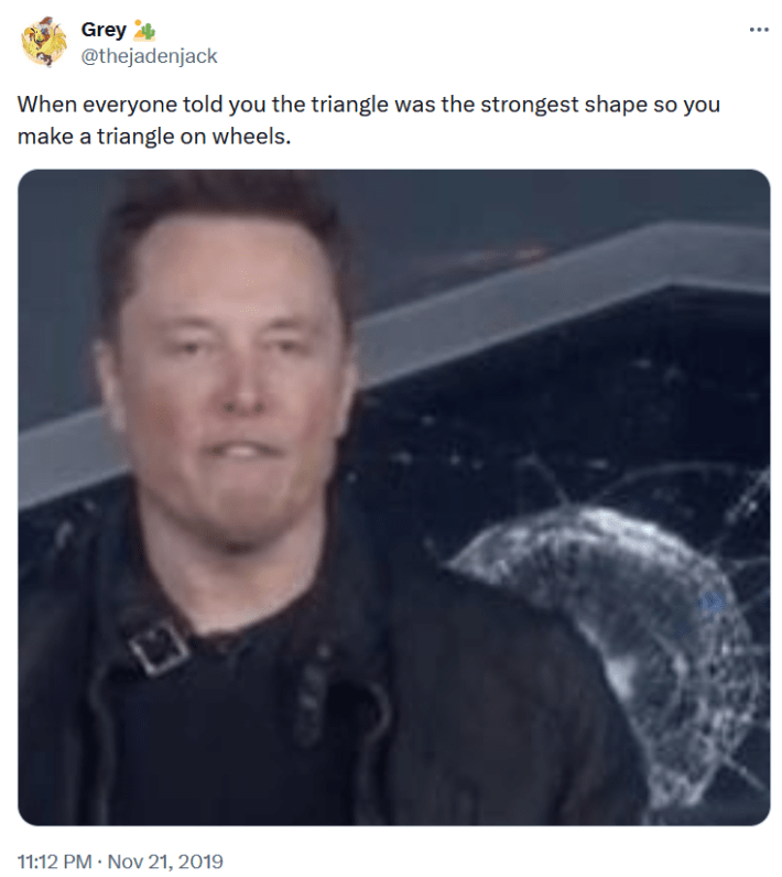 People were making Cybertruck memes long before its launch, particularly after the disastrous demonstration way back in 2019. Musk attempted to show that its windows were unbreakable by asking a demonstrator to throw a hard object at one of them point-blank. The glass immediately cracked.