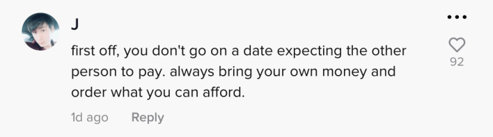 Although the comment could not be found by the Daily Dot, it was alleged by other TikTokers that @heydiberber revealed she asked the man on the date. Some felt that because she asked him on the date, she should have expected to pay for the both of them.