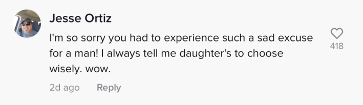 "I'm so sorry you had to experience such a sad excuse for a man," one commenter wrote. "I always tell my daughters to choose wisely. Wow."
