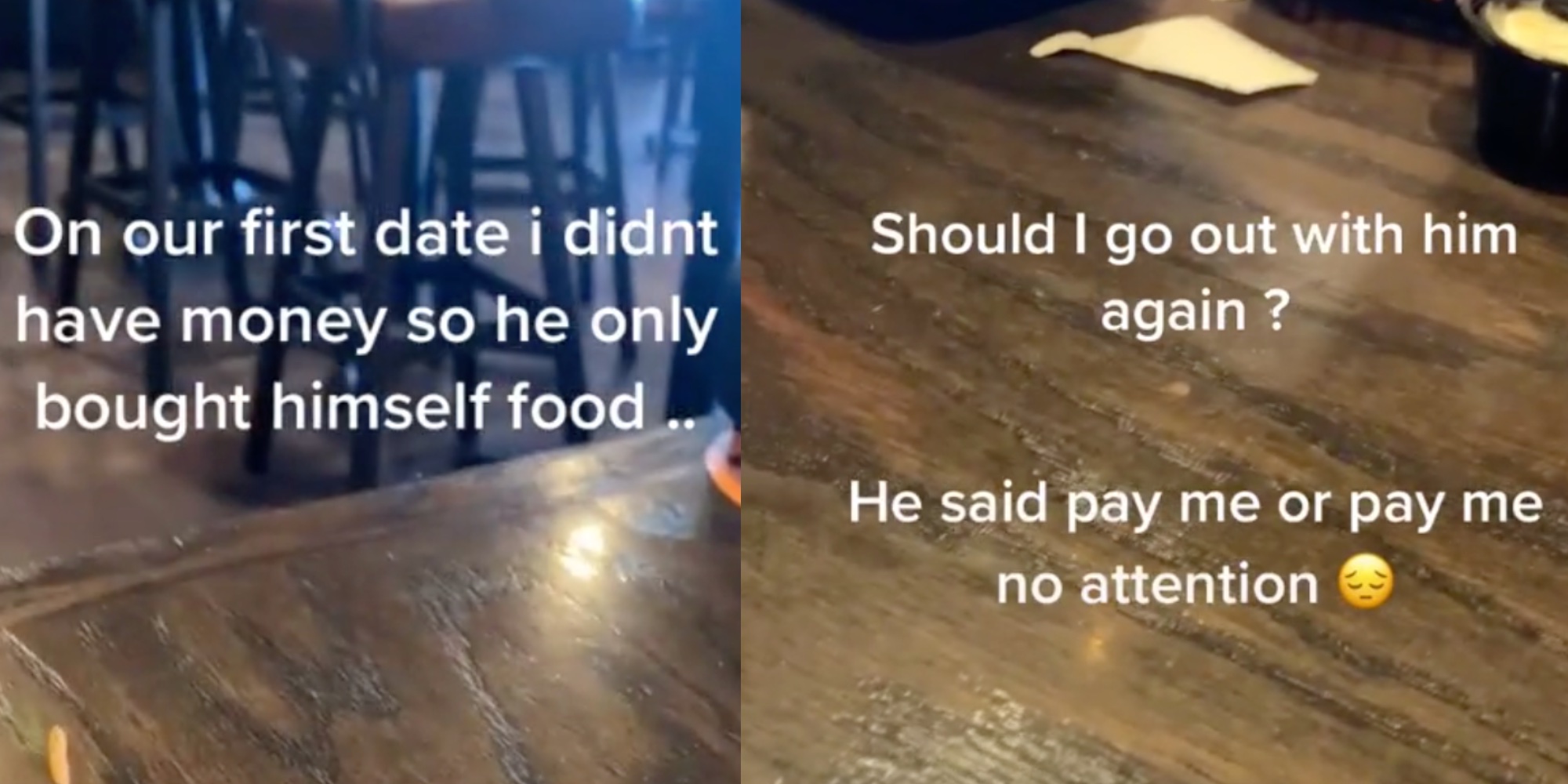 "On our first date I didn't have money so he only bought himself food," text overlay on the video, posted by @heydiberber, reads. "Should I go out with him again? He said pay me or pay me no attention."
