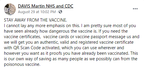 The group, DAVIS Martin NHS and CDC, urges people, "Get your Covid19 vaccination card without being vaccinated so as to avoid the vaccination scheme." It claims that the cards are "authentic, valid and registered" with the Centers for Disease Control and Prevention (CDC) and agencies in other countries.