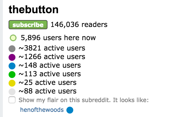 A gray dot indicates that the user has not yet pressed the button, while pressing between 59 and 52 seconds yields a purple button, pressing between 42 and 51 seconds yields a blue button and so on. There are many purple "Buttonists" but the other colors are considerably more rare—and some have yet to be unlocked. Some users have made efforts to organize around The Button in order to unlock these new color badges.