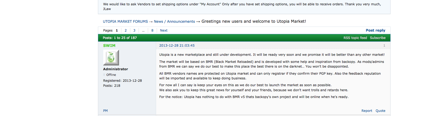 “All BMR vendors names are protected on Utopia market and can only registrar (sic) if they confirm their PGP key,” explains one forum post. “Also the feedback reputation will be imported and available to keep doing business.” Utopia also promises to automatically encrypt users’ personal messages, and to add convenient search filters.