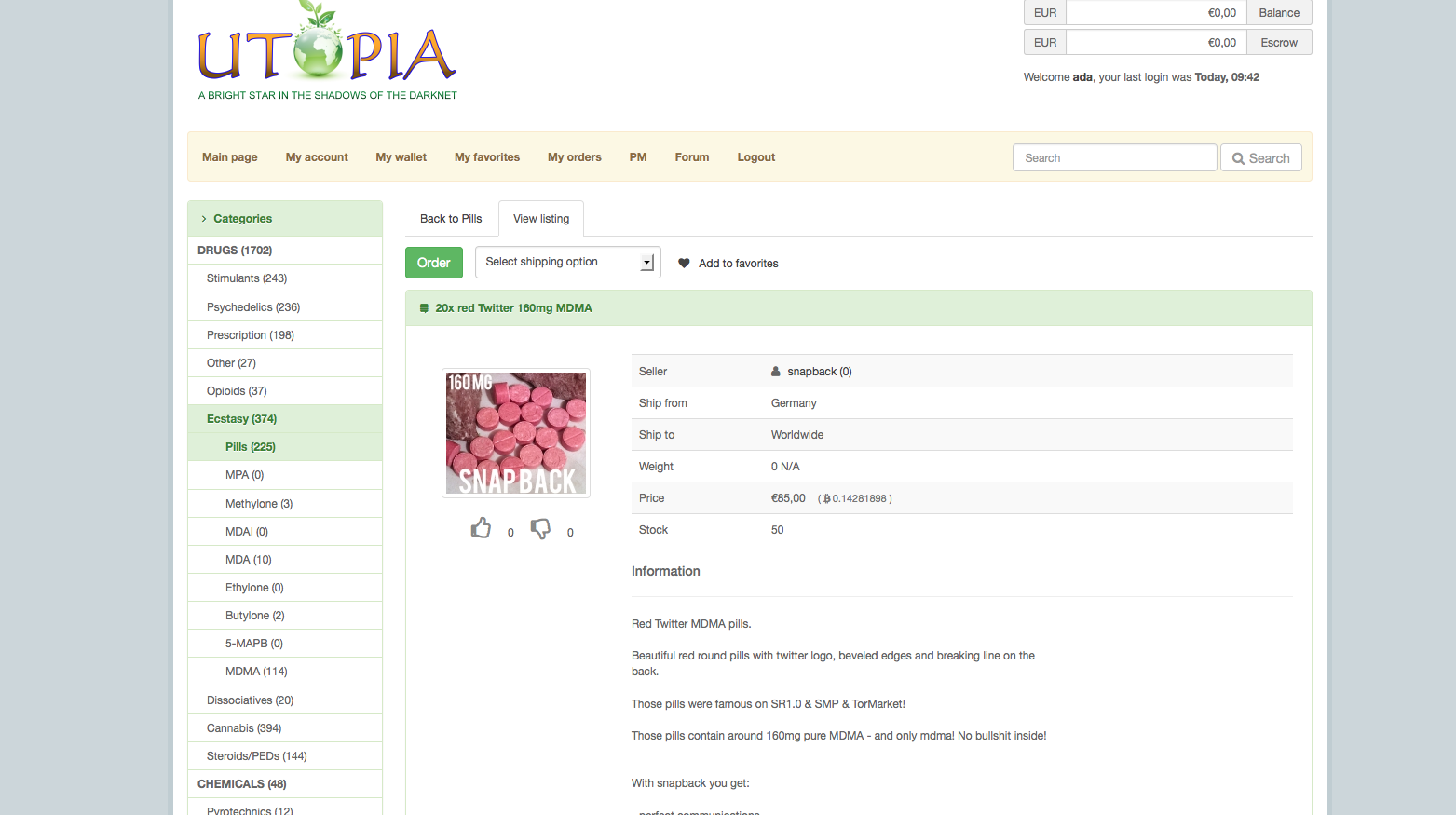 In just a matter of days, the market has collected a staggering number of listings: 1700 in the Drug category; 62 under Service, which includes hacking and gambling; 24 in the Weapons section; and 88 in the Ebook category. Utopia’s forum, which has been online for a while on a separate address, counts over 3000 users and a growing number of posts and topics.