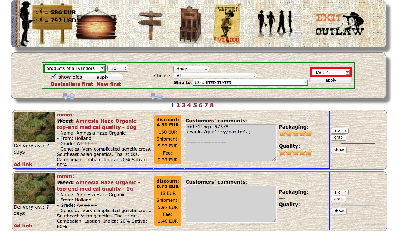 Both of these markets are considered at least relatively stable. The Agora Market has a spartan layout, lists roughly 2,400 drug-related items, has got a popular Information category that includes hacking how-to guides, and a Counterfeit section that’s full of watches. The Outlaw Market shows a funny Old West-style design, and it takes a very international approach: Its interface can be configured to use different languages. Apparently, judging from its login page, it’s even looking for admins for different countries and regions.
