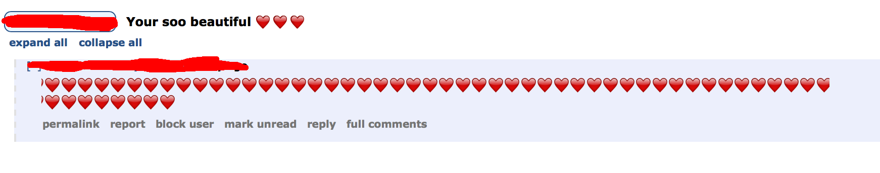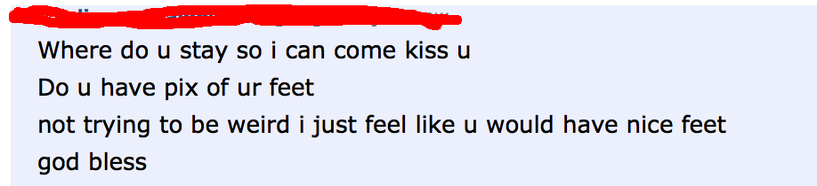 I have a high tolerance for creepy, and I know this one isn’t so bad. It’s just a bunch of hearts! Enjoy the compliment, Kristen! Ignore his username, which insinuates that he kills people in his spare time! Lighten up, would you?