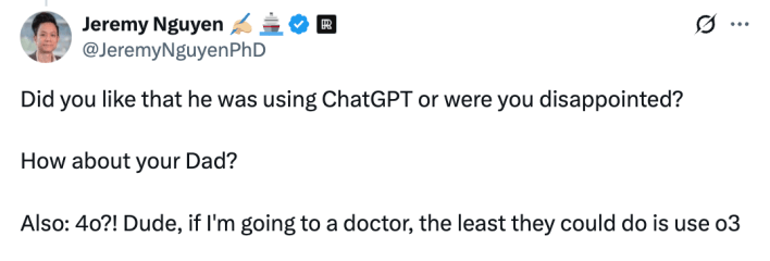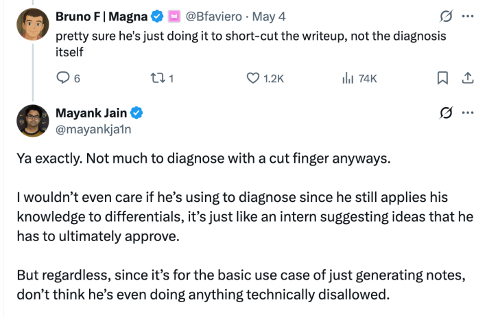 "Took my dad in to the doctor cus he sliced his finger with a knife and the doctor was using ChatGPT," Mayank Jain (@mayankja1n) shared on X in early May. "Based on the chat history, it’s for every patient."