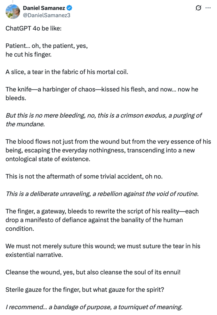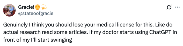 As a cut finger doesn’t require deep medical knowledge, most people weren’t too bothered by this particular instance of AI usage, including Jain. However, even the possibility of having to deal with long waits, hefty insurance premiums, and additional payments just to have a doctor check with ChatGPT—something we could all do at home—sparked frustration.