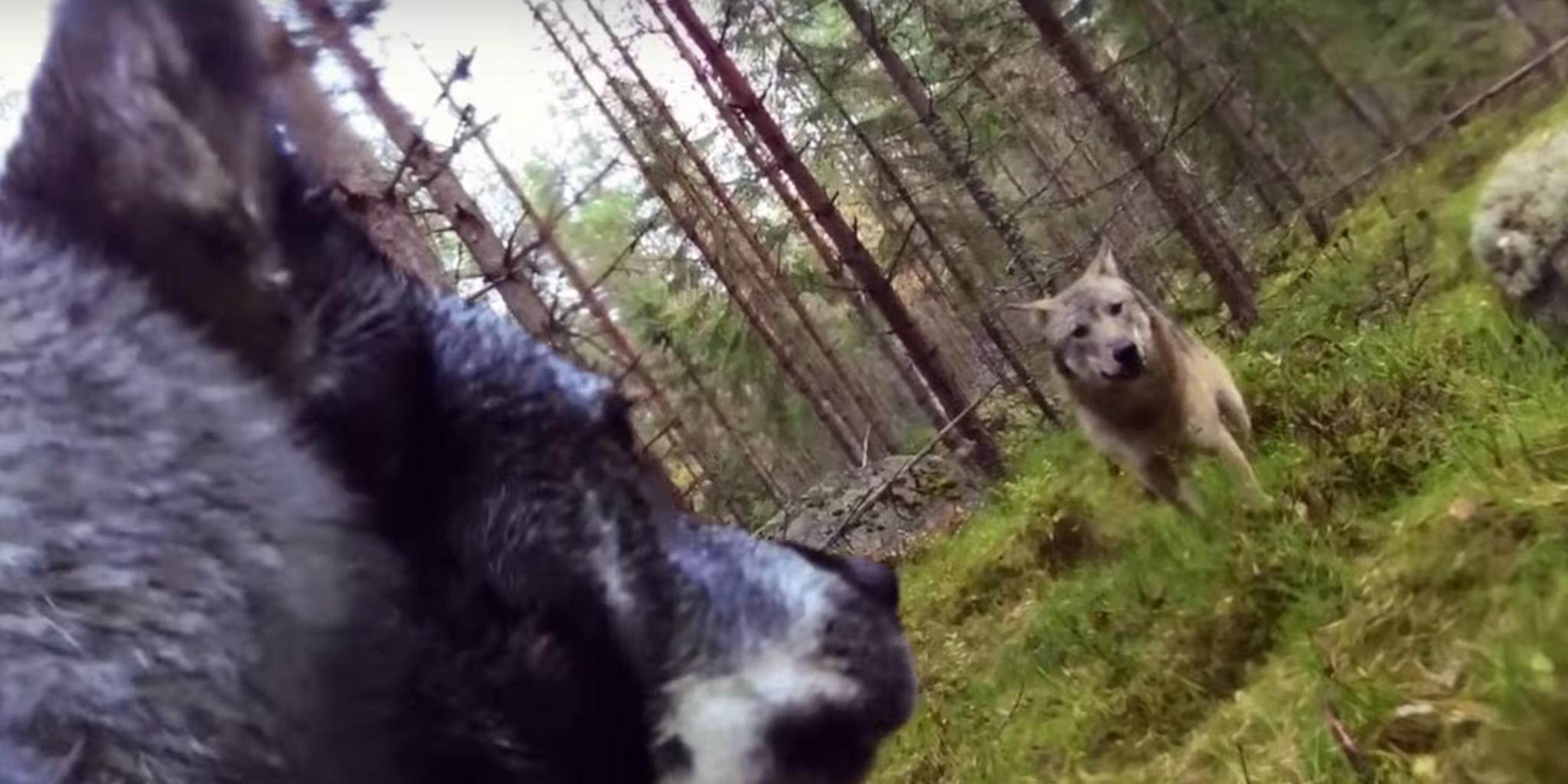 A Swedish elkhound outfitted with a GoPro and its owner were moose hunting in a Swedish forest, when the dog came upon a wolf. You can see the moment the dog notices it, peering out from behind a tree. At first there's some tense curiosity, but then a second wolf shows up.