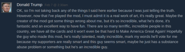 The modder who built Donald Trump’s America goes by Ballistic on the Steam forums, writes "This mod is for entertainment purposes. Make of that what you will," in the Discussion section for the mod. Ballistic’s Steam profile is set to private, so he or she couldn't be reached for comment via Steam.