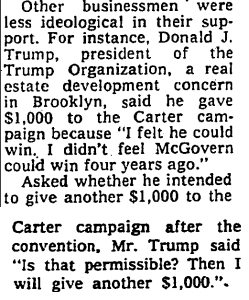 It had at least something to do with the fact that Trump donated money to the Carter campaign and, using his already considerable mid-70s celebrity, publicly spoke out in favor of the Democrat's campaign for the White House.