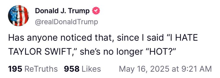 "Has anyone noticed that, since I said "I HATE TAYLOR SWIFT," she's no longer "HOT?"" Trump wrote on his Truth Social platform.