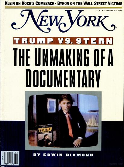 Ned Schnurman, an Emmy-winning television producer mostly known for his role in the creation of the successful television series on press criticism, Inside Story, reportedly approached Stern about a series documenting men “whose persona took on a life of its own.” In the front page story of the September 1989 issue of New York Magazine, Edwin Diamond details the “feud” between Trump and Stern, and the process by which the documentary was made and ultimately failed to be distributed, resulting in little more than a screening of the film in Bridgehampton.