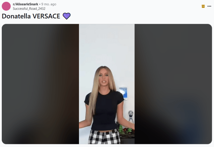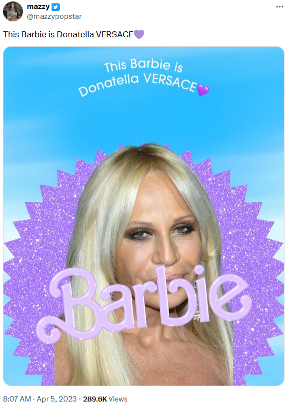 After that, it spread to Reddit and Twitter, where people would post photos of Versace models with the Donatella Versace purple heart emoji comment. During the Barbie poster trend in April 2023, Twitter user @mazzypopstar created one of those with the fashion designer's image and the caption, "This Barbie is Donatella VERSACE 💜."