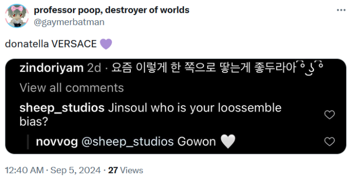 In 2024, for reasons unknown, the Donatella Versace 💜 meme saw a resurgence in the form of users posting videos with captions or descriptions that utilize one word in all lowercase letters followed by another in all caps, and then the emoji.