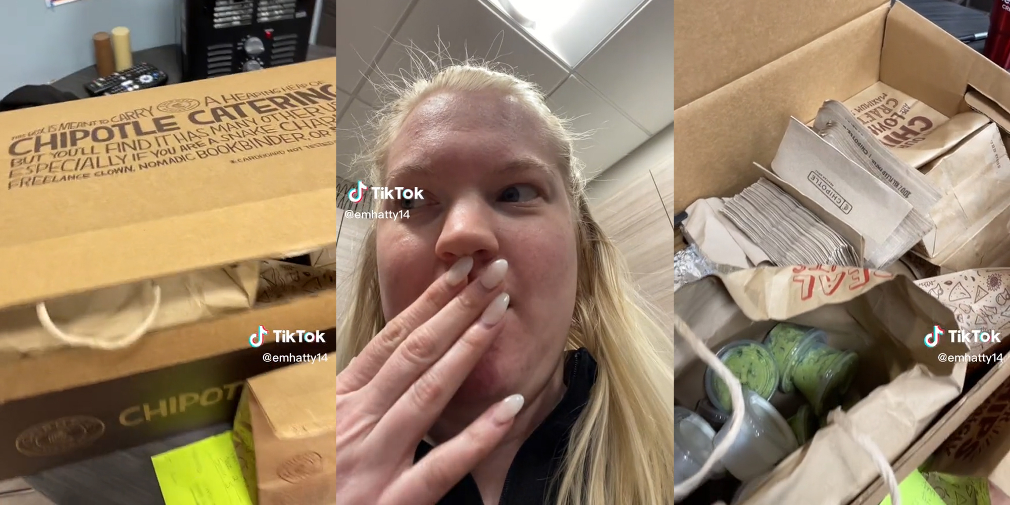In a video posted to TikTok, user Emily (@emhatty14) says that she purchased a burrito bowl for herself while she was at work. Her DoorDash driver, however, apparently messed up Emily’s request and delivered the bulk order—which contained “15 burritos” instead. As of Monday morning, Emily’s video had 23,800 views.