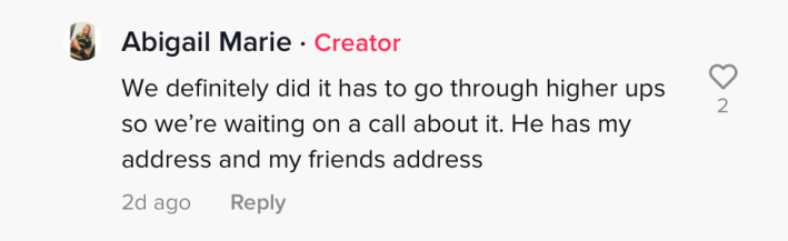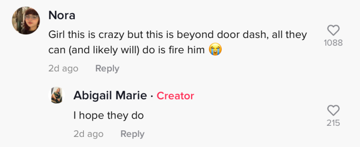 In another comment, the TikToker said that DoorDash handled the situation and let the driver go. She also said the company said it would cooperate if she needed a representative to speak with the police.