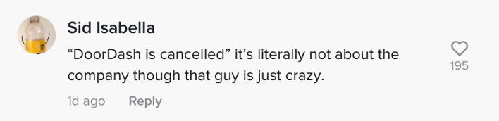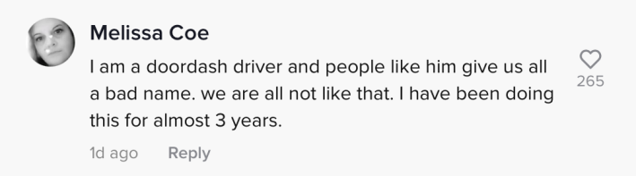 "I am a DoorDash driver and people like him give us all a bad name," one commenter wrote. "We are not all like that. I have been doing this for almost three years."