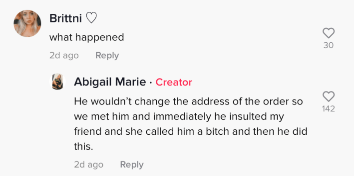 "He wouldn't change the address of the order so we met him and immediately he insulted my friend and she called him a bitch and then he did this," the poster wrote.