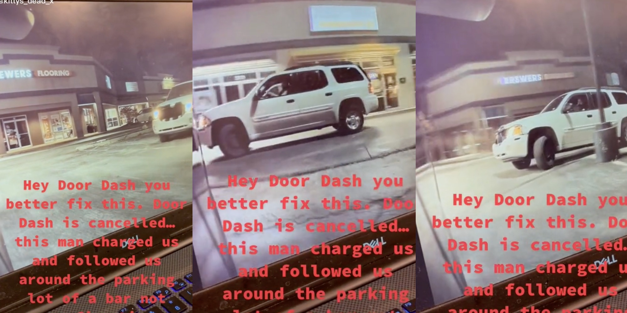 "Hey DoorDash fix this," a text overlay on the video reads. "DoorDash is canceled...this man charged us and followed us around the parking lot of a bar not once, but five times."