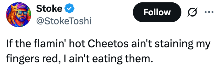 "If the flamin' hot Cheetos ain't staining my fingers red, I ain't eating them," X user @StokeToshi posts.
