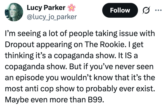 @lucy_jo_parker added: "If you’ve never seen an episode, you wouldn’t know that it’s the most anti-cop show to probably ever exist. Maybe even more than B99."