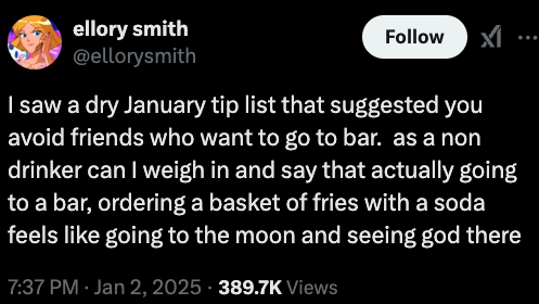 Tweet about Dry January that reads, "I'm doing dry january unless a guy invites me out or if there's a birthday or maybe a cool pop-up"