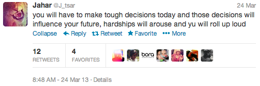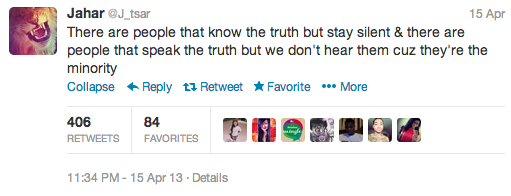 That may be true, but it doesn't rule out the notion that Tsarnaev is behind @J_tsar. In fact, tweets sent in 2012 between Tsarnaev and a buddy suggest the Tsarnaev actually changed his name to something far less explicit than its original distinction. What's now @J_tsar was once @jahar_tsar, a direct allusion to the pronunciation, and family nickname, of his true first name.