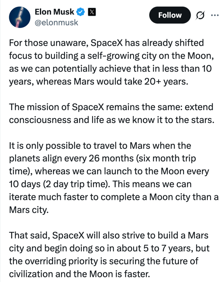 In a lengthy post on X, Musk added: "For those unaware, SpaceX has already shifted focus to building a self-growing city on the Moon, as we can potentially achieve that in less than 10 years, whereas Mars would take 20+ years."
