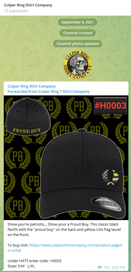 A Telegram channel called Culper Ring Shirt Company launched Sept. 6, the same day Tarrio reported to jail. The channel, which includes "PB" in its URL, advertised a variety of custom and generic Proud Boys branded merchandise. Each post included a link to the Culper Ring Clothing website.