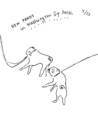 "I recently started making illustrated nacho reviews for a friend's website, so I've been carrying a sketchbook around with me," Andujar told the Daily Dot. "Last week, I stopped by Brooklyn Bridge Park on my way home from work. I was on a bench reading a book when I heard a jingling noise, looked up and saw a beautiful black pug heading right toward me. I instinctively grabbed my sketchbook and added her to the blog soon after. It felt totally natural to jump right back into it."