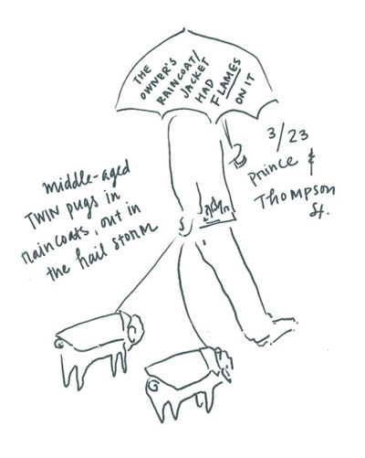 "The pugs looked so unhappy to be outside in a hailstorm, but their matching raincoat outfits were perfect," she said. "Their owner looked equally miserable and had on a very '90s raincoat with race car-style flames on it. I thought that was such a good catch—totally worth braving the bad weather."