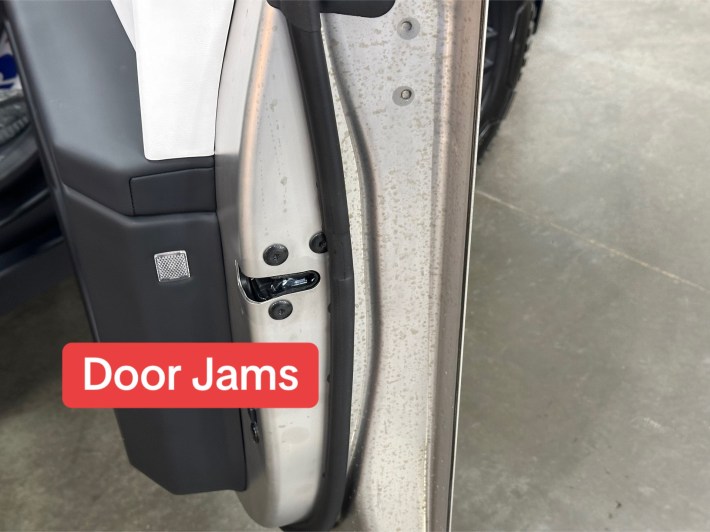 In this YouTube video from DIY Detail, a mechanic demonstrates how to clean the Cybertruck door jams. “From the factory, they come looking a little worse for wear,” the detailer says. “And the chemical I’m using is a little different. It’s not something we use as a spray and wipe application. And that’s iron remover.” He demonstrates that with the iron remover, and the discoloration quickly wipes away. “We are removing iron particles from here,” he says. “The stainless steel does not rust. What happens is, in the manufacturing process, you get a little residue on it. And what we’re doing now is removing that residue. Once it’s done, you’ll never have to do it again.”