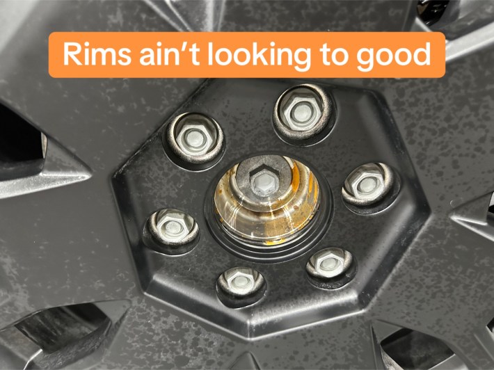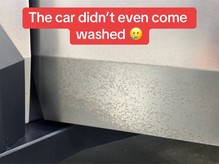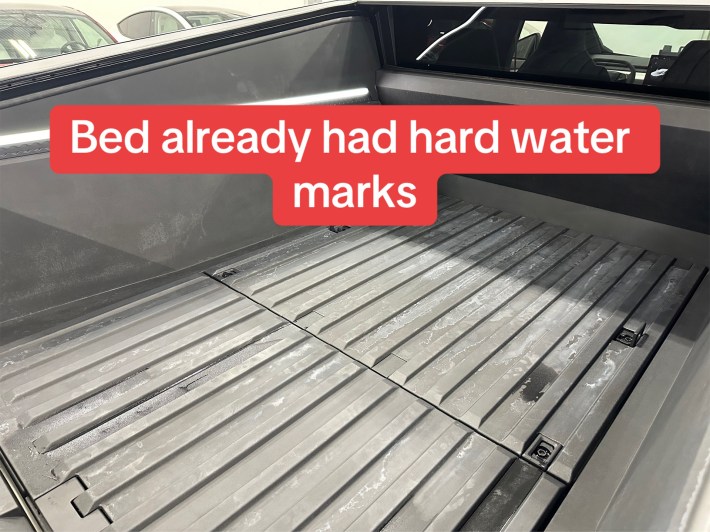 Next up is the truck bed. The TikToker shows what looks like hard water marks. Most of the dialogue online has thus far focused on cleaning of the exterior of the Cybertruck, but owners have also had trouble with splotchy marks appearing on the bed liner after cleaning. In this Cybertruck owners forum thread, someone suggested this Black on Black Instant Trim Shine Exterior Spray Dressing and Protectant. Other Cybertruck owners have purchased removable bed liners.