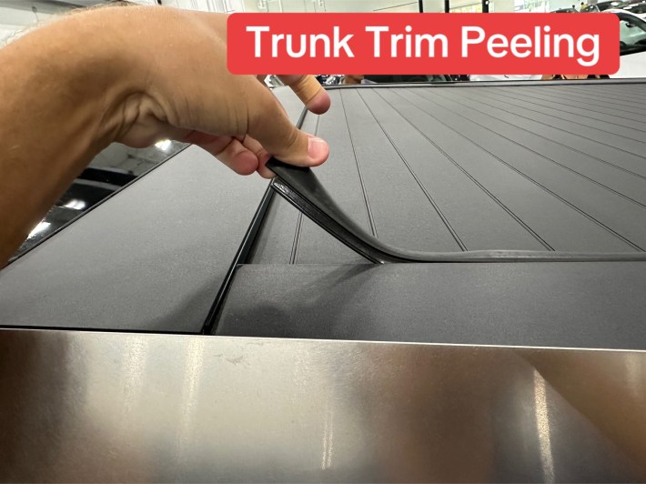 The second slide shows a stretchy material protruding from one of the Cybertruck’s doors. It looks like it might be the lining of the door frame sticking out of place. From our research, it doesn’t appear to be a widespread issue. The Cybertruck door itself is another matter entirely, however. A man went viral after revealing that he sliced his leg on the door while exiting the vehicle. And he isn’t the only one to sustain a minor injury from one of the truck’s unexpectedly sharp panels.
