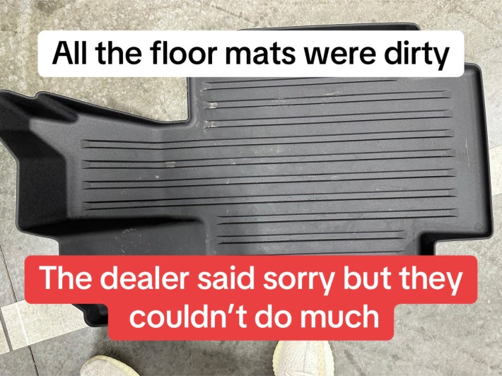 The next slide is a photo of the driver’s side floor mat, which is muddy. In the comments, a user wrote, “I would’ve rejected delivery. The damage and the fact that it’s not even washed is absolutely insane.” The TikToker replied, “We had no choice! They had our downpayment already.” Another Cybertruck owner reported his vehicle was delivered dirty—and that was just the start of his nightmare.