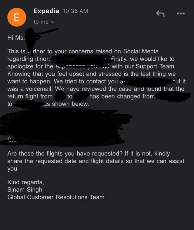 “In one of the videos, it appeared that her situation had been resolved as she stated that she had her flight changed to the correct date,” said Nisreene Atassi, Senior Director, Global Head of Social Media and Influencer Engagement at Expedia, in an email. She stated the social team had no detailed information on Y until they asked her for it. “Our response was based purely on the video she had posted.”