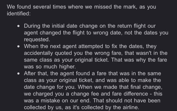 At this point, Y said she just wanted her first flight back but was told she’d have to pay for that, too, since now the original flight was sold out. After some back and forth—Y had apparently spoken to about five different agents by this point—an agent said they did find flights for the $112 price Y had initially agreed to. Apparently, the other agent had misquoted the fares, which were for upgraded flights. The entire process took about two days and about five hours, Y said.
