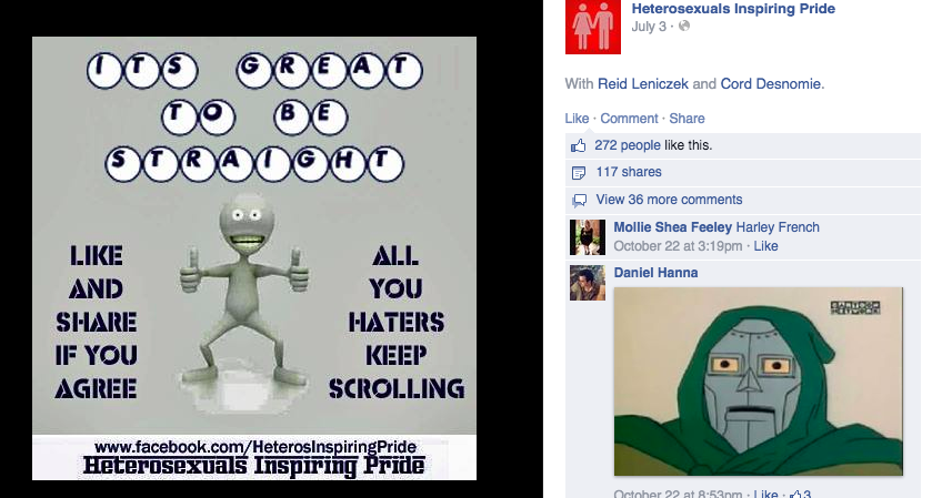 “This is a heterosexual page,” the page explains. “We (this page) does not hate you. We hate the hate that is being put forth by the LGBT community against people that disagree with them. If the LGBT community could have done their ‘cause’ without coming on line attacking people that did not agree with them, pages like this one would have never been created. ... In truth, society is tired of all the heterophobic bigotry aimed at people that have morals and standards.” Of course it is!