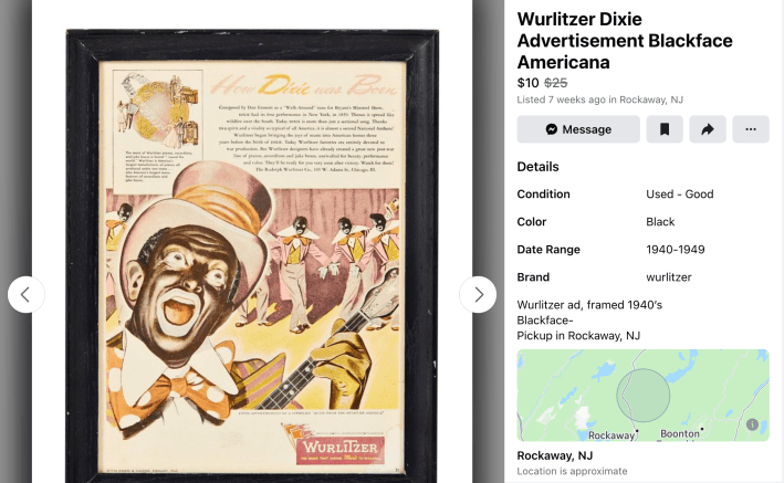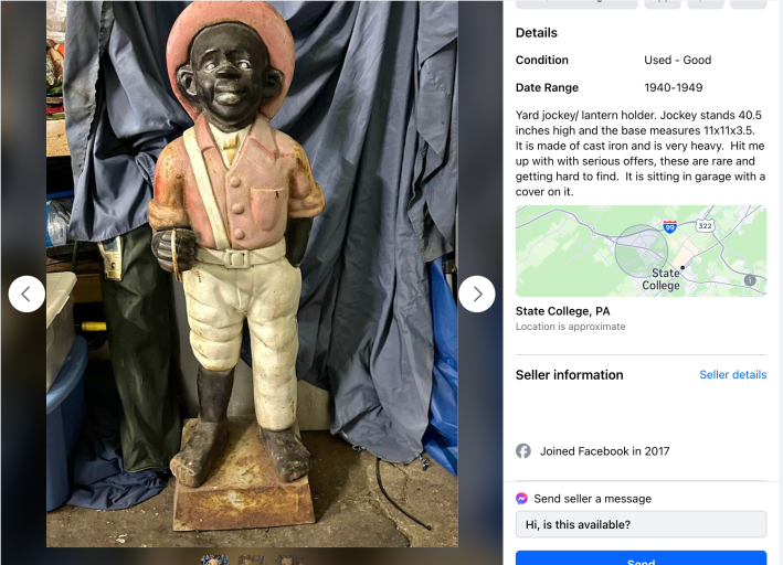 But a massive, hard-to-track market exists online. And on Facebook, racist memorabilia is sold alongside vintage clothing, gently used furniture, and benign tchotchkes.