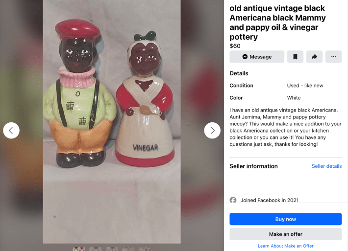 “I have an old antique vintage black Americana, Aunt Jemima, Mammy and pappy pottery,” one seller wrote in a Marketplace listing for Mammy and Pappy salt and pepper shakers the Daily Dot found on Feb. 27, 2024. “This would make a nice addition to your black Americana collection or your kitchen collection or you can use it!”