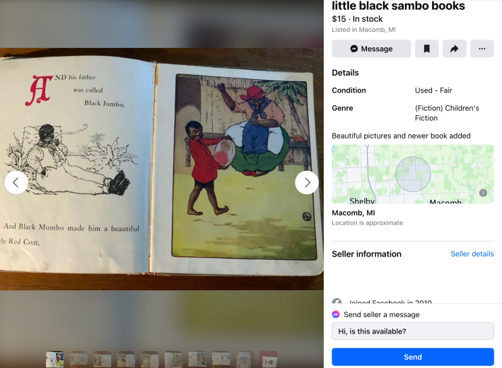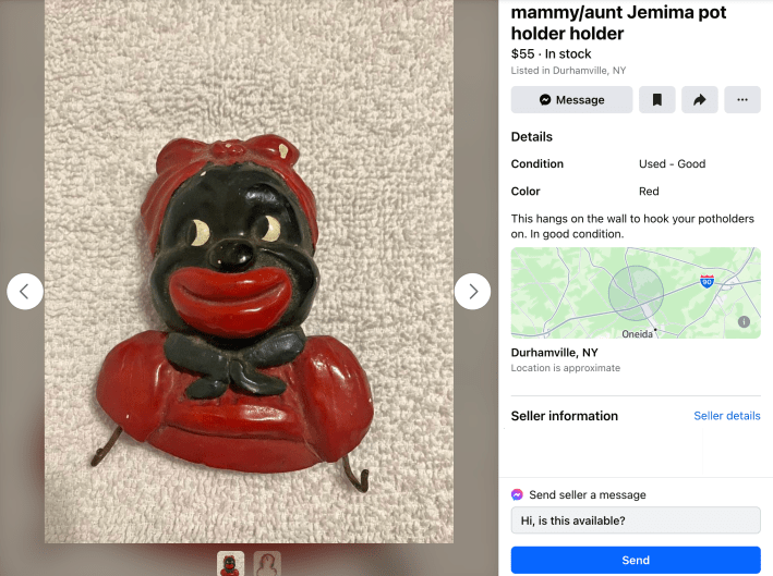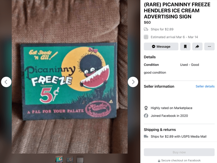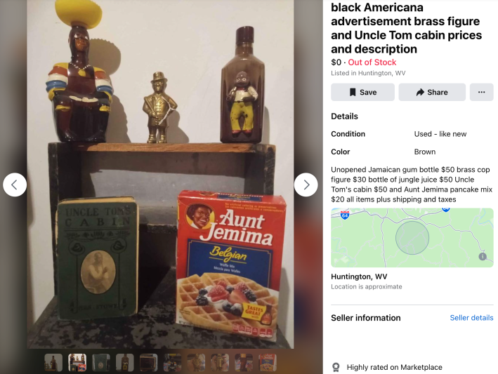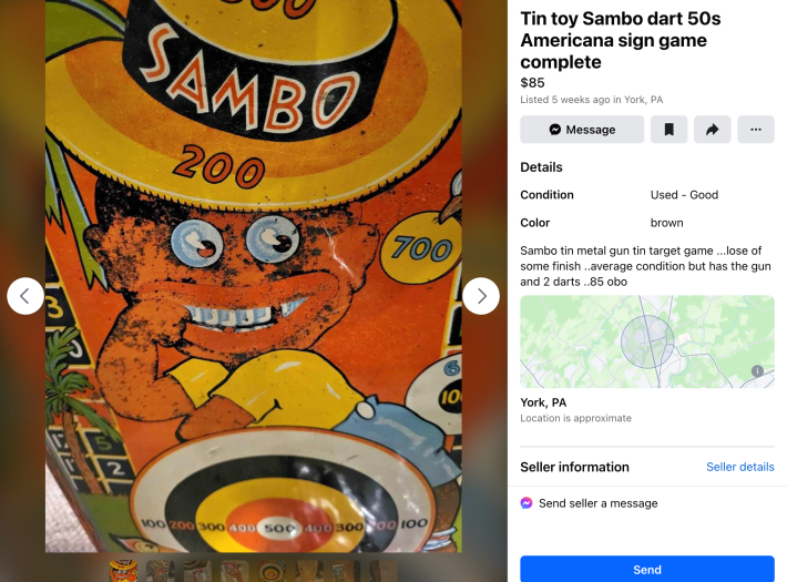 But just as Facebook’s moderators struggle to control content on a large scale, Black Americana products and racist memorabilia constantly slip past Facebook’s guidelines on Marketplace.