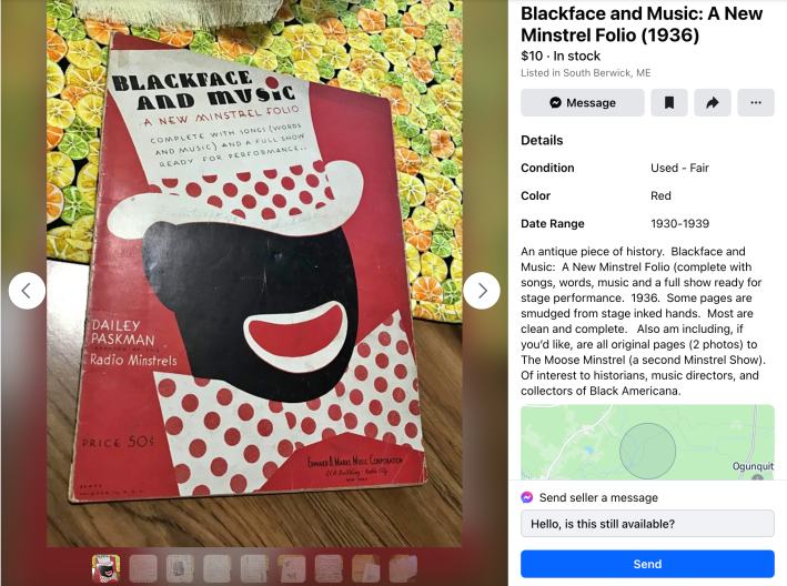 “An antique piece of history,” a seller wrote in the description of a listing for “Blackface and Music: A New Minstrel Folio.” The Daily Dot found the item on March 6, 2024. “A full show ready for stage performance.”
