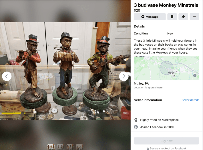 “These 3 little Minstrels will hold your flowers in the bud vases on their backs [and] play songs in your head,” a seller wrote in the description for the minstrel monkeys listing the Daily Dot found. “Imagine your friends when they see these cute little Monkeys at your house.”