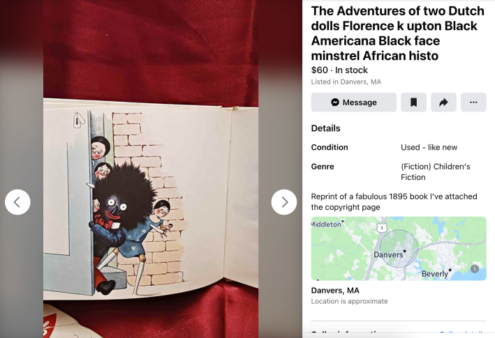 The Daily Dot found 17 listings on Facebook Marketplace that included Golliwog dolls or Golliwog products, like books, art, perfumes, and marionettes. The Golliwog dolls the Daily Dot found were priced between $25 and $350, and Golliwog paraphernalia cost as little as $8 and much as $220.