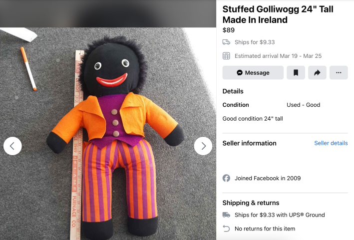 One Golliwogg listing seems to acknowledge the doll’s racist origins: “Black Americana Black face minstrel,” is included in one listing’s name. In the item’s description, the seller called a Golliwogg children’s picture book “a fabulous 1895 book.”